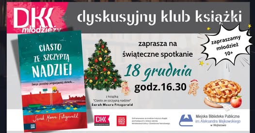 W grudniu główną książką do dyskusji będzie ""Ciasto ze szczypta nadziei" Sarah Moore Fitzgerlad. Znajomość książki nie jest obowiązkowa.  Udział w dyskusji nie wymagany, choć mile widziany. Spotkanie w miłym towarzystwie, przy ciastku i herbacie.