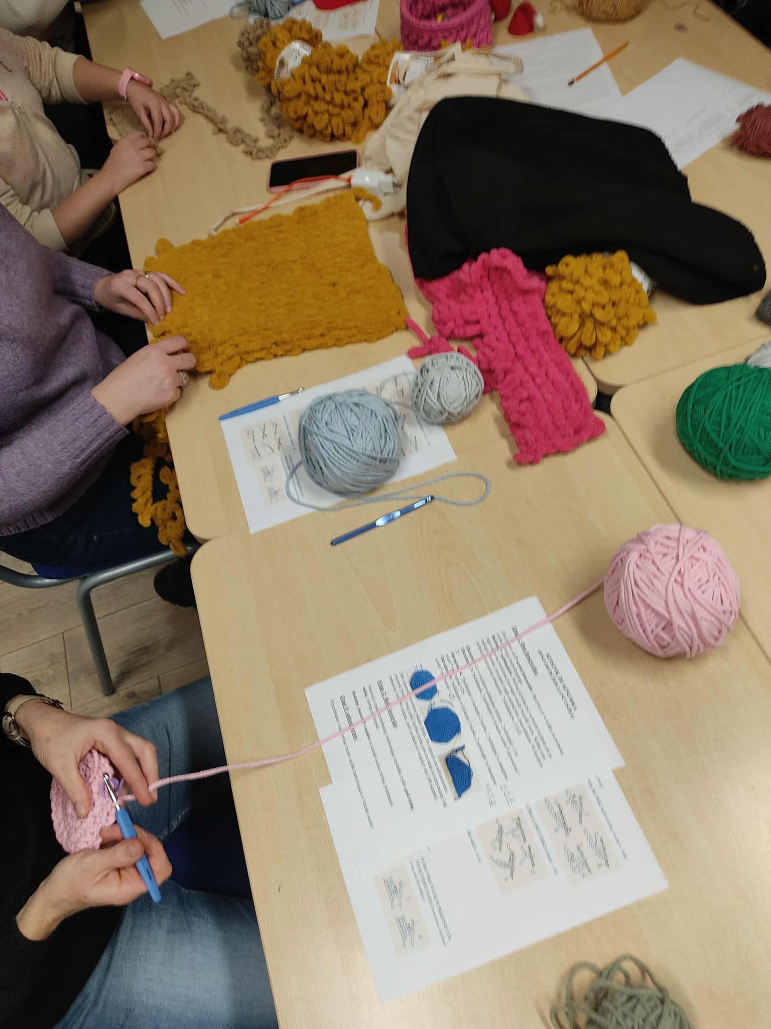 W jednej były osoby, które uczyły się podstaw, tworząc ze sznurka bawełnianego koszyk. Inne tworzyły świątecznego krasnala. Niektórzy też dokańczali torbę zaczętą na ostatnim spotkaniu lub ćwiczyły technikę tworzenia na włóczce pętelkowej. Uczestnicy wykazali się wielką motywacją do nauki i zaangażowaniem w swoje robótki. Czas niestety umknął nam niemiłosiernie i większość nie zdążyła dokończyć swoich dzieł. Jest za to chęć spotykania się dalej, my chętnie tą prośbę spełnimy. Następne warsztaty niebawem.
