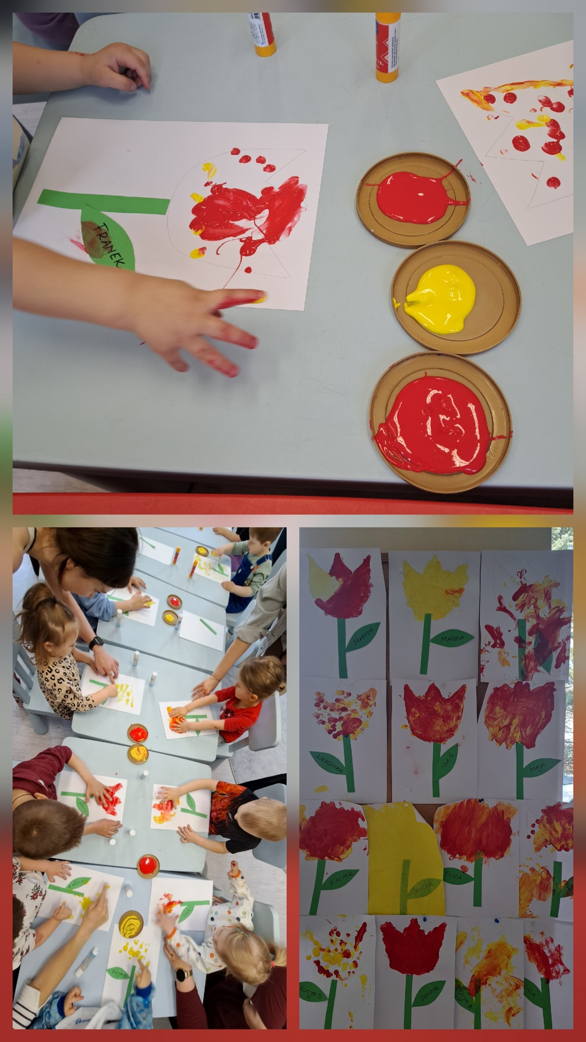 Pracą plastyczną było stworzenie pięknego, wiosennego kwiatka - tulipana. Zadaniem dzieci było naklejenie łodygi i liścia, a następnie pomalowanie kwiatu palcami.