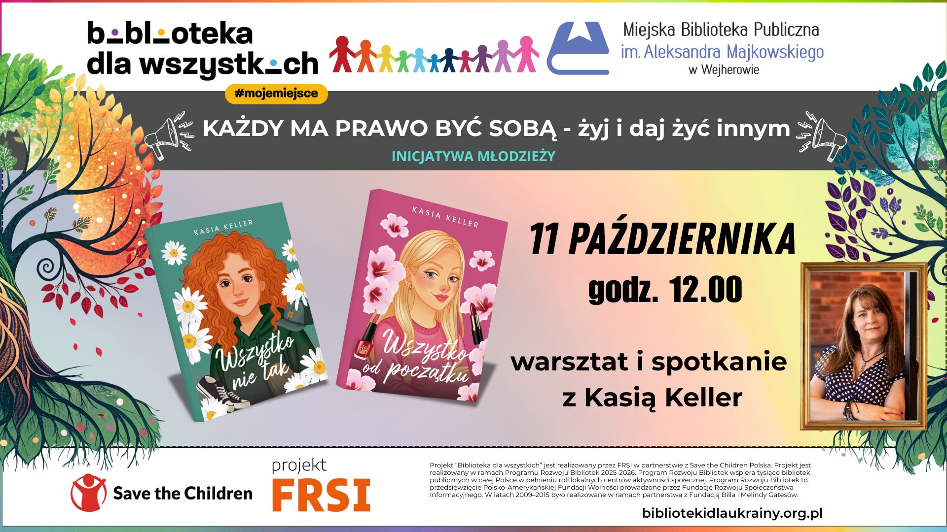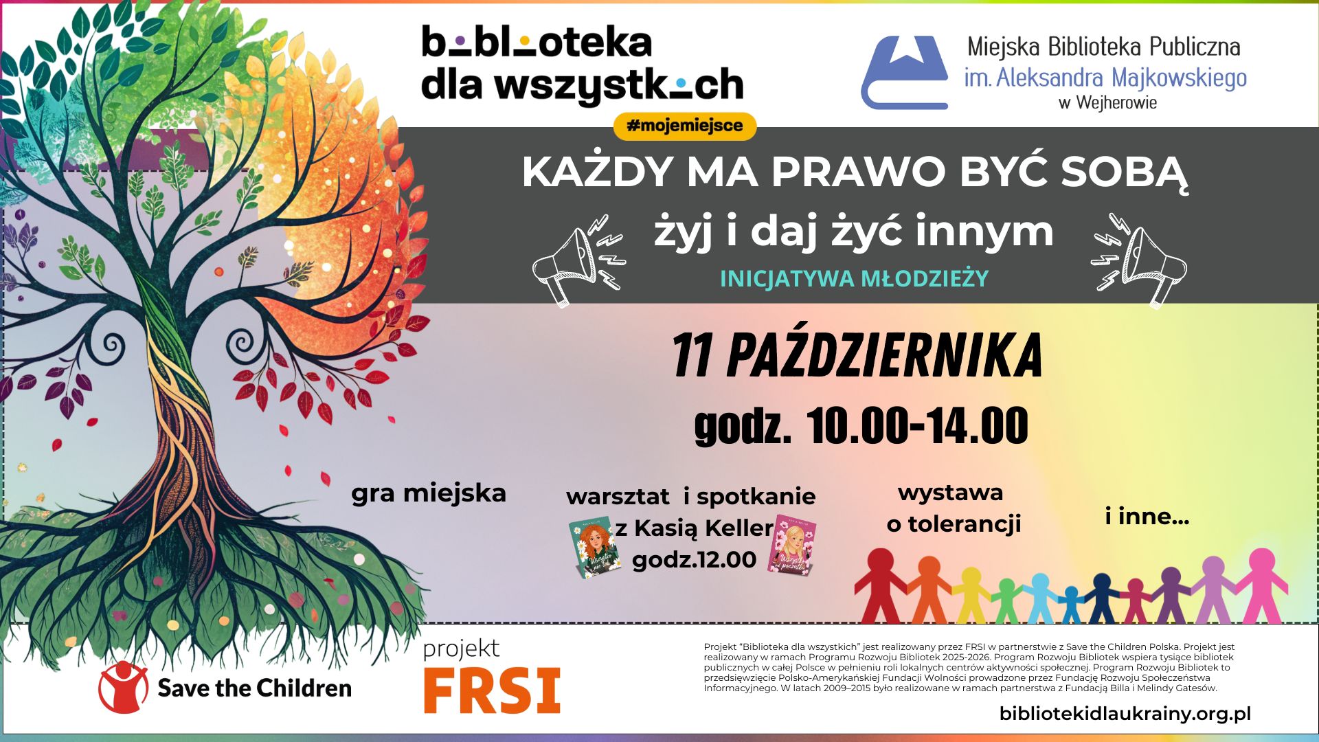 W godzinach 10-14 planowana jest gra miejska, która będzie się odbywać na terenie biblioteki, wystawa o tolerancji oraz spotkanie z Kasią Keller.