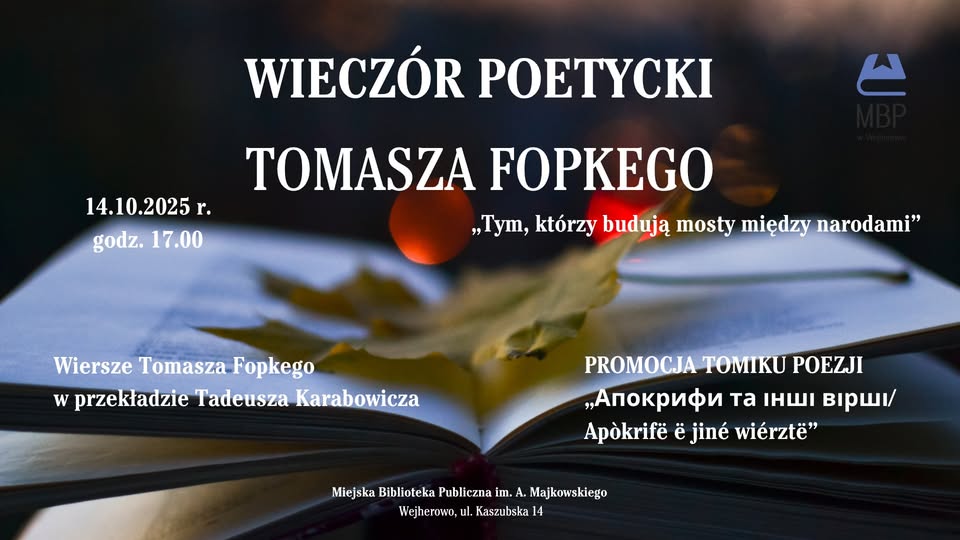 Serdecznie zapraszamy na wieczór poetycki Tomasz Fopkego i promocję tomiku: "Апокрифи та інші вірші/ Apòkrifë ë jiné wiérztë". Wspomniany tomik to zbiór 22 wierszy kaszubskich Tomasza Fopkego w tłumaczeniu na język ukraiński przez Tadeusza Karabowicza. Jest to publikacja dwujęzyczna. Zawiera wiersze powstałe w ostatnich latach o różnorodnej tematyce. Są to utwory stanowiące komentarz do aktualnych wydarzeń, dla dzieci, odwołujące się do Biblii oraz pytania natury egzystencjalnej. Nie brak w nich właściwych dla autora humoru i ironii. Autorem ilustracji na okładce jest wejherowianin Maciej Tamkun. Wejherowska promocja będzie pierwszą z cyklu. Tomik posiada dedykację: Tym, którzy budują mosty między narodami.