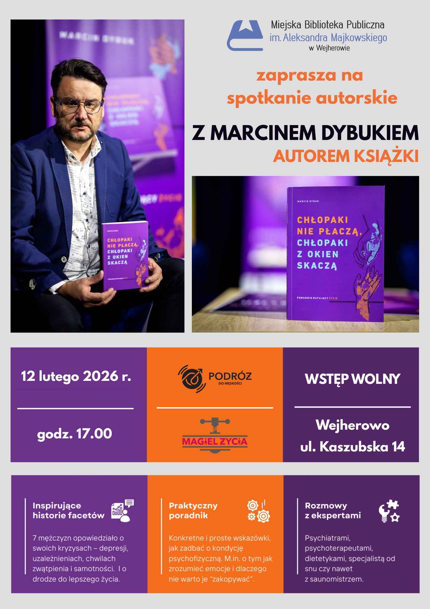 Zapraszamy na spotkanie z Marcinem Dybukiem wokół, szczerej do bólu książki o kondycji psychicznej mężczyzn. To publikacja, która przełamuje tabu, pokazuje prawdziwe historie mężczyzn zmagających się z depresją, uzależnieniami i kryzysami, a jednocześnie daje praktyczne wskazówki i głos ekspertów.