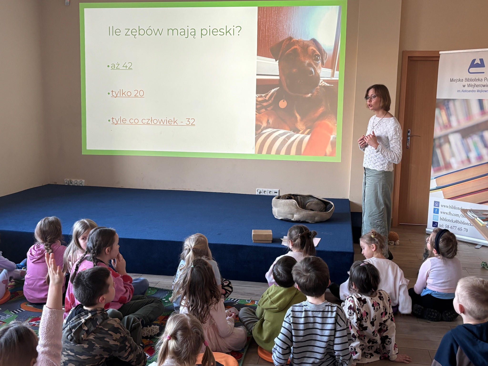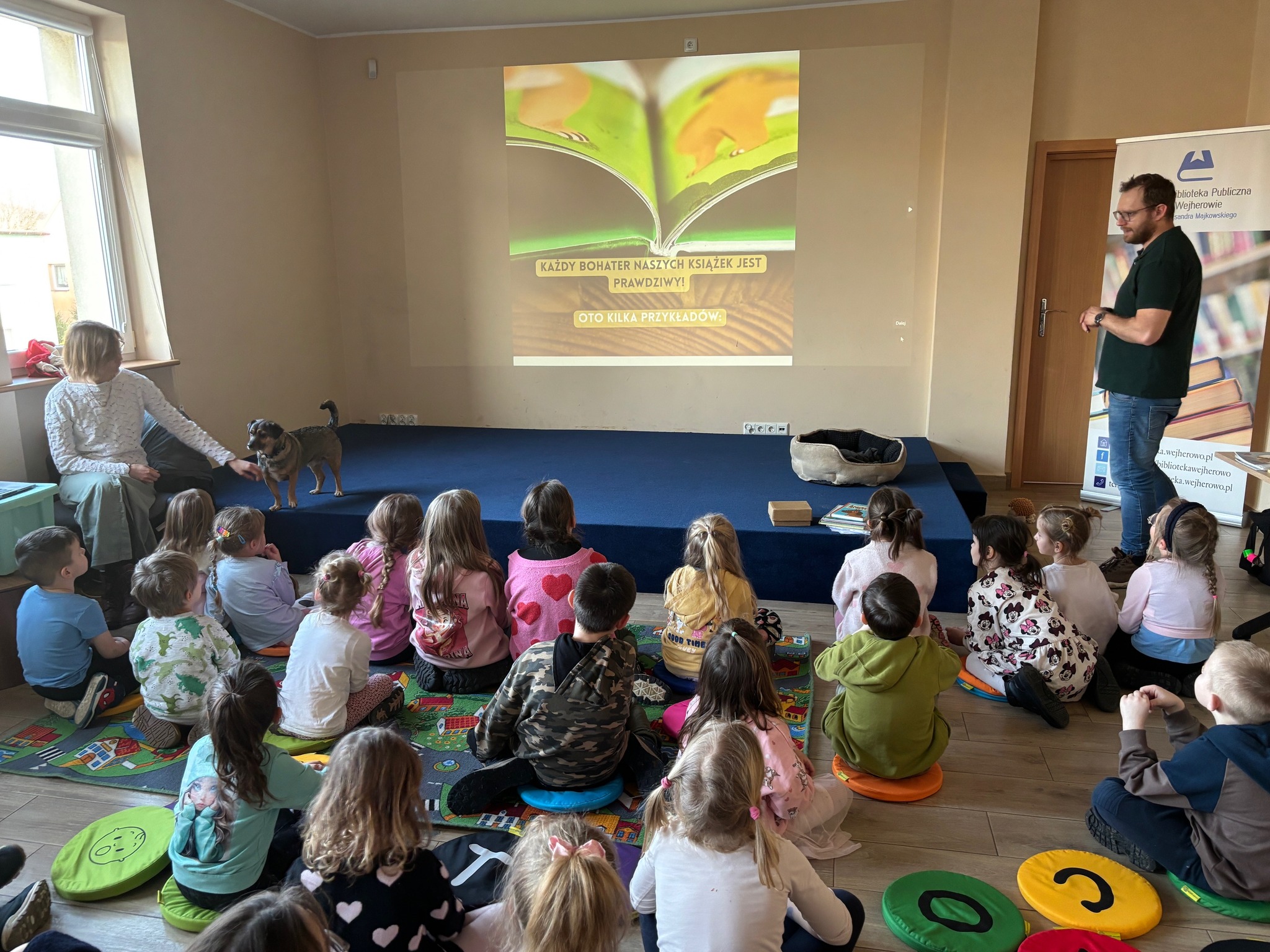 W piątek (27.02) odbyły się warsztaty wokół książki pt. "Precel i rodzinne spotkania", na który zaprosiliśmy najmłodszych czytelników. Dzieci miały okazję spotkać się z Martą Maj, autorką serii o przygodach psa Precla. Pisarka przedstawiła i przeczytała fragment swojej niedawno wydanej książki. Odbyła się też zabawa ruchowa oraz gra na nowych kartach "Psich emocji". Największą atrakcją spotkania była obecność samego bohatera książeczek - psa Precla. Autorka przedstawiła pokrótce zwierzaczka oraz opowiedziała również różne ciekawostki odnośnie zachowań, emocji psów. Być może opowieści te zachęciły dzieci i rodziców do posiadania futrzastych milusińskich w swoich domach. Pewne jest to, że pies Precel - bohater książek, zaskarbił sympatię uczestników. Dziękujemy za mile spędzony czas. Zapraszamy na inne, zbliżające się warsztaty w bibliotece.