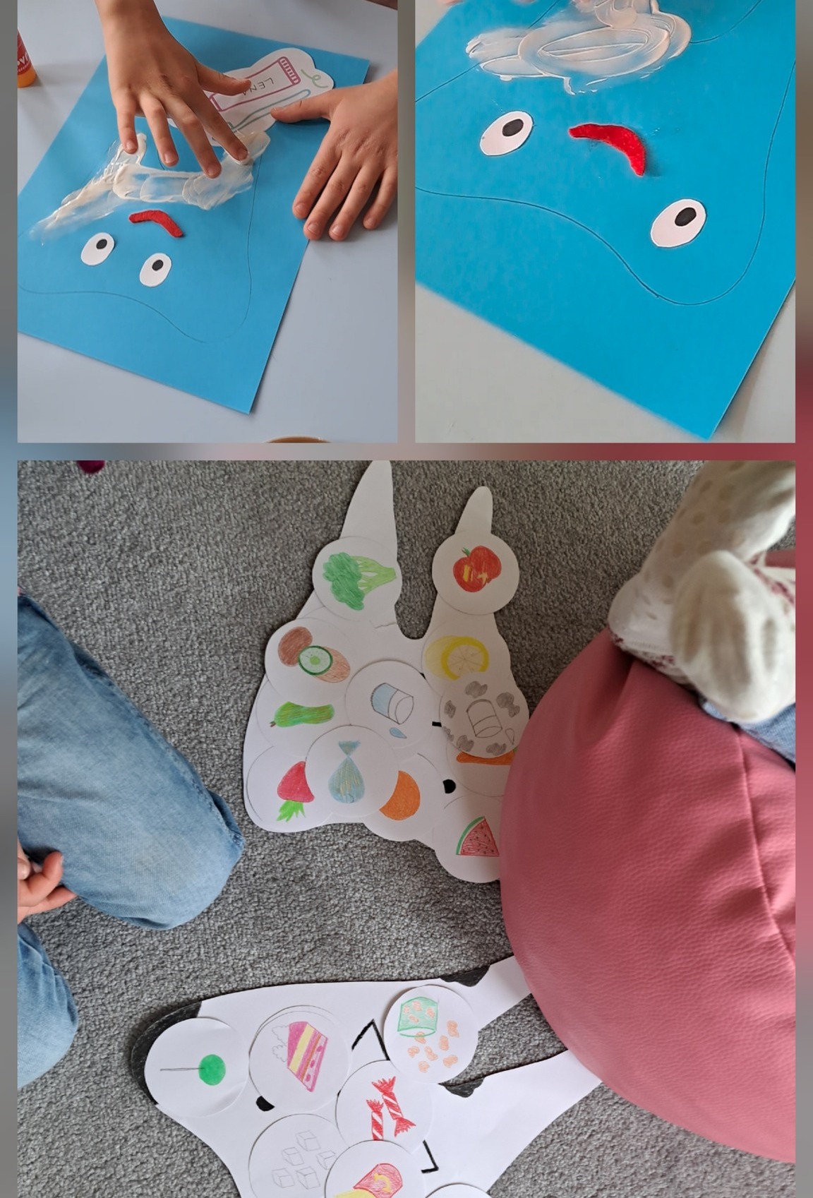 Kolejną grupową zabawą była zabawa z sensoryczną gumą, która ćwiczyła koordynację ruchową oraz współpracę w zespole.